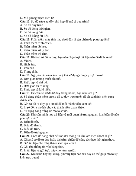 Câu 17. Khi tạo sơ đồ tư duy, bạn nên chọn loại dữ liệu nào để đính kèm? A. Video. B. Hình ảnh. C. Văn bản. D. Trang tính.