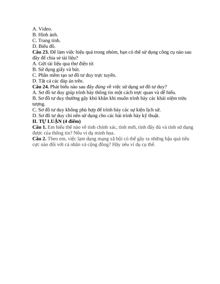 Câu 22. Khi trình bày nội dung, phương tiện nào sau đây có thể giúp mô tả sự kiện trực quan? A. Video. B. Hình ảnh. C. Trang tính. D. Biểu đồ.