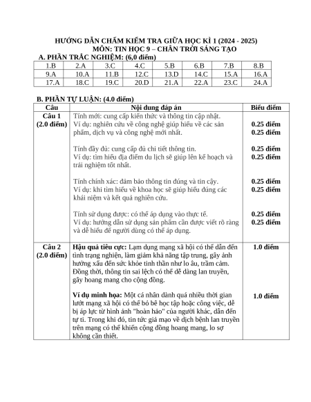 TIN HỌC 9 – CHÂN TRỜI SÁNG TẠO NĂM HỌC: 2024 - 2025