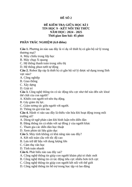 Đề thi giữa kì 1 Tin học 9 Kết nối tri thức (Đề 2)