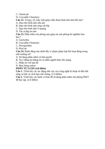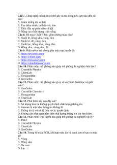 Câu 10. Phần mềm mô phỏng nào giúp mô phỏng thí nghiệm hóa học? A. Crocodile Physics B. ChemLab C. Flowgorithm D. GeoGebra