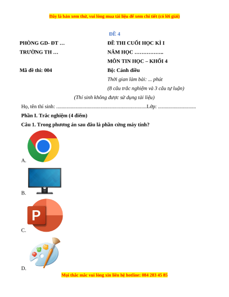 MÔN TIN HỌC – KHỐI 4 Mã đề thi: 004 Bộ: Cánh diều