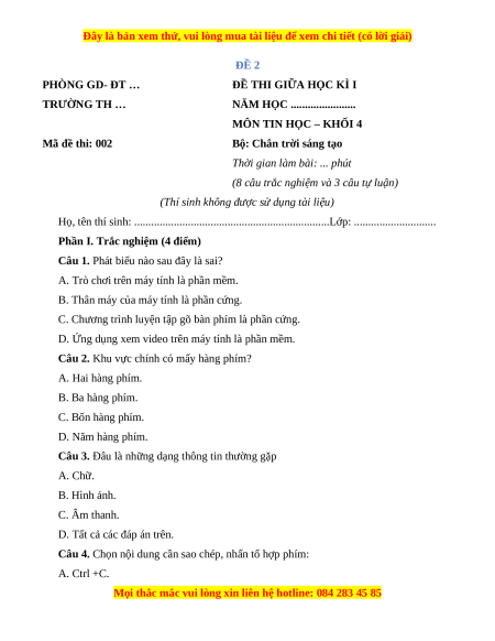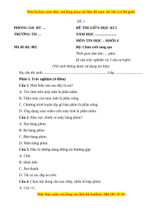 MÔN TIN HỌC – KHỐI 4 Mã đề thi: 002
