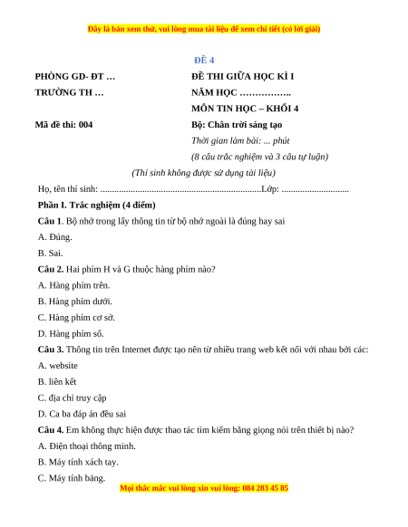 - Tailieugiaovien.com.vn giới thiệu 4 đề giữa kì 1 gồm đầy đủ ma trận và lời giải chi tiết môn Tin học lớp 4 Chân trời sáng tạo mới nhất năm 2023 nhằm giúp Giáo viên có thêm tài liệu tham khảo ra đề thi Tin học lớp 4.