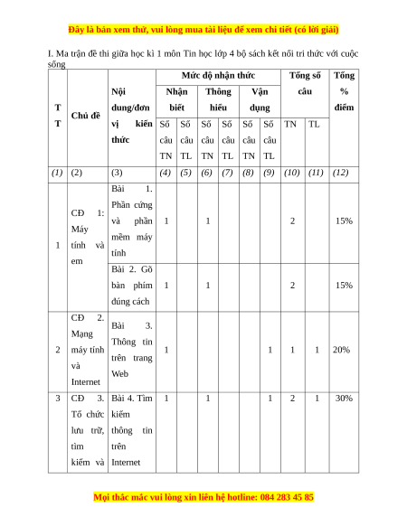 (4) (5) (6) (7) (8) (9) (10) (11) (12) Bài 1. Phần cứng CĐ 1: và phần 1 1 2 15% Máy mềm máy 1 tính và tính em Bài 2. Gõ bàn phím 1 1 2 15% đúng cách CĐ 2. Bài 3. Mạng Thông tin 2 máy tính 1 1 1 1 20% trên trang và Web Internet 3 CĐ 3. Bài 4. Tìm 1 1 1 2 1 30% Tổ chức kiếm lưu trữ, thông tin tìm trên kiếm và Internet