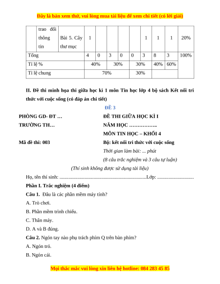 II. Đề thi minh họa thi giữa học kì 1 môn Tin học lớp 4 bộ sách Kết nối tri