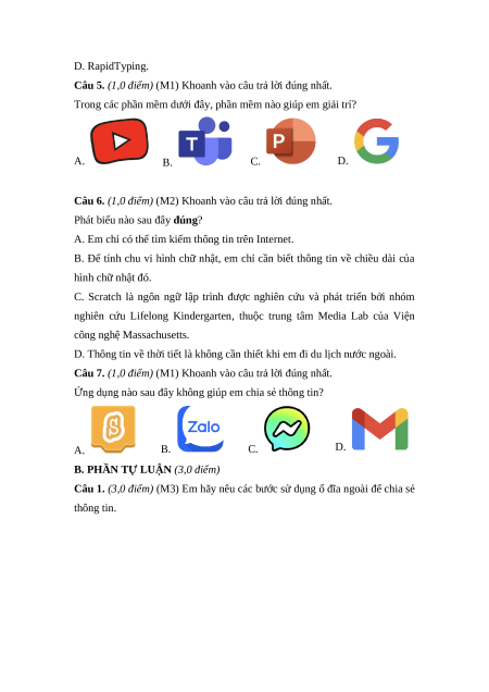 Câu 5. (1,0 điểm) (M1) Khoanh vào câu trả lời đúng nhất.