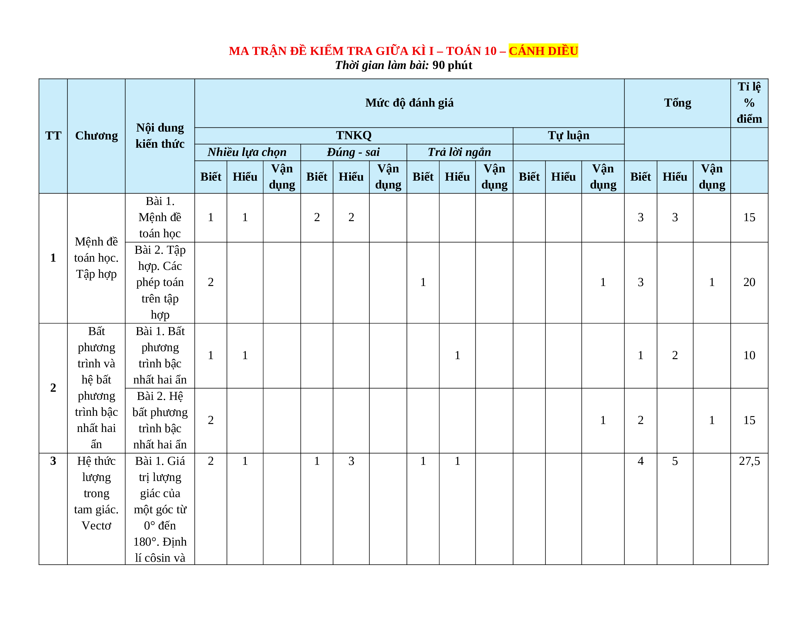 MA TRẬN ĐỀ KIỂM TRA GIỮA KÌ I – TOÁN 10 – CÁNH DIỀU