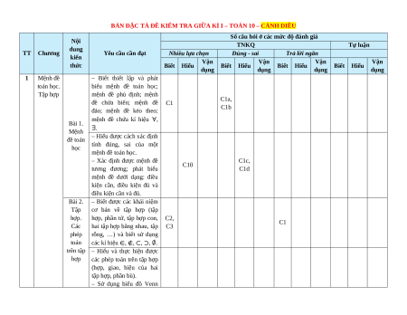 BẢN ĐẶC TẢ ĐỀ KIỂM TRA GIỮA KÌ I – TOÁN 10 – CÁNH DIỀU