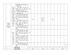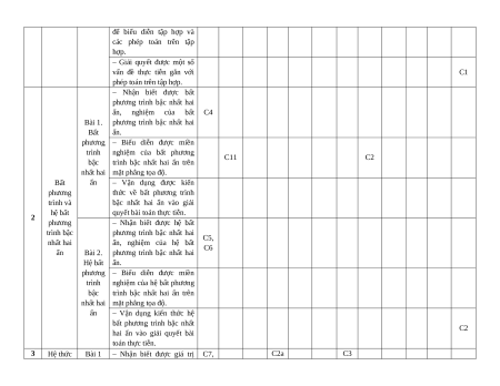 Trả lời ngắn Vận Vận Vận Vận Vận Biết Hiểu Biết Hiểu Biết Hiểu Biết Hiểu Biết Hiểu dụng dụng dụng dụng dụng Bài 1. Mệnh đề 1 1 2 2 3 3 15 toán học Mệnh đề Bài 2. Tập 1 toán học. hợp. Các Tập hợp phép toán 2 1 1 3 1 20 trên tập hợp Bất Bài 1. Bất phương phương 1 1 1 1 2 10 trình và trình bậc hệ bất nhất hai ẩn 2 phương Bài 2. Hệ trình bậc bất phương 2 1 2 1 15 nhất hai trình bậc ẩn nhất hai ẩn 3 Hệ thức Bài 1. Giá 2 1 1 3 1 1 4 5 27,5 lượng trị lượng trong giác của tam giác. một góc từ Vectơ 0° đến 180°. Định lí côsin và định lí sin trong tam giác Bài 2. Giải tam giác. Tính diện 1 1 1 1 12,5 tích tam giác Tổng số câu 9 3 0 3 5 0 2 2 0 0 0 3 14 10 3 Tổng số điểm 3,0 2,0 2,0 3,0 4,0 3,0 3,0 10 Tỉ lệ % 30 20 20 30 40 30 30 100 Lưu ý: