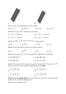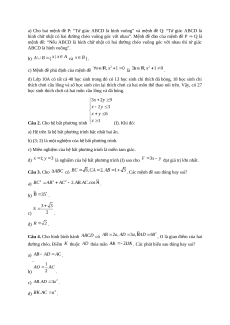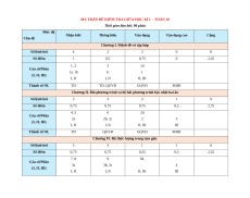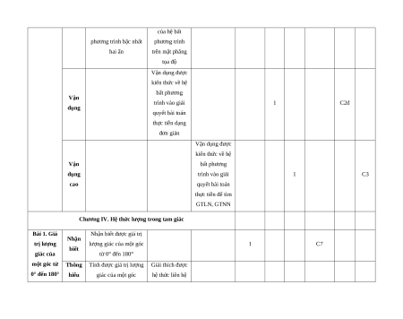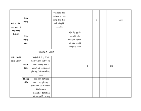 Chương IV. Hệ thức lượng trong tam giác Số lệnh hỏi 3 3 1 1 8 Số điểm 0,75 0,75 0,25 0,5 2,25 7, 8 9 3d, Câu số/Phần 3a 3b, 3c 4 (I, II, III) I, II I, II II, III III Thành tố NL TD QGVĐ GQVĐ MHH Chương V. Vectơ Số lệnh hỏi 3 3 2 1 9 Số điểm 0,75 0,75 0,75 0,5 2,75 Câu số/Phần 10 11, 12 4d 6 (I, II, III) 4a, 4b 4c 5 Thành tố NL TD QGVĐ GQVĐ MHH Tổng điểm 3,25 2,75 2,5 1,5 10 Lưu ý: