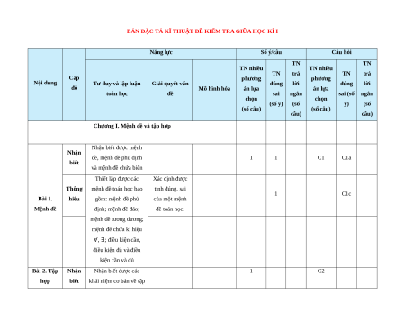 Chương I. Mệnh đề và tập hợp Số lệnh hỏi 4 2 2 0 8 Số điểm 1 0,5 0,75 0 2,25 1, 2 3 1d Câu số/Phần 1a, 1b 1c 1 (I, II, III) I, II I, II II, III Thành tố NL TD TD, QGVĐ GQVĐ MHH
