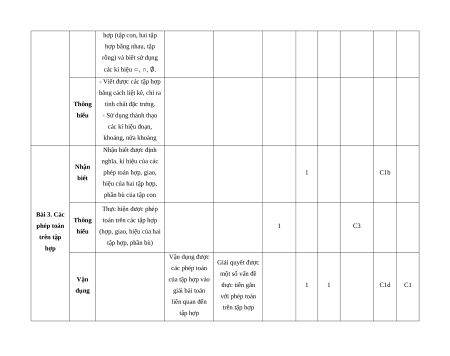 Nhận biết được định nghĩa, kí hiệu của các Nhận phép toán hợp, giao, 1 C1b biết hiệu của hai tập hợp, phần bù của tập con Thực hiện được phép Bài 3. Các Thông toán trên các tập hợp phép toán 1 C3 hiểu