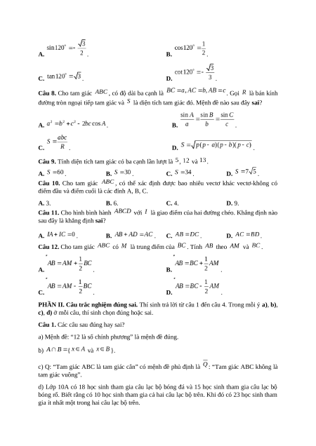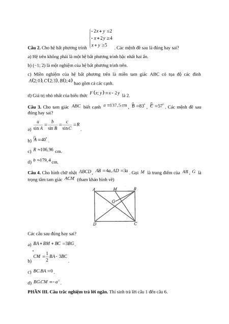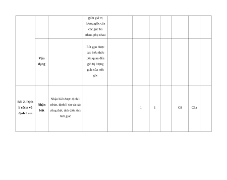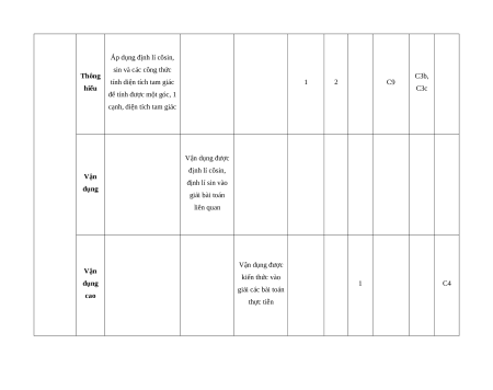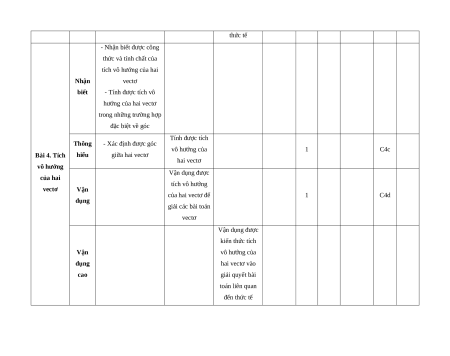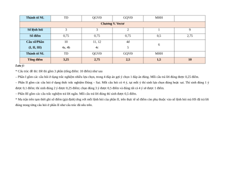 Chương IV. Hệ thức lượng trong tam giác Số lệnh hỏi 3 3 1 1 8 Số điểm 0,75 0,75 0,25 0,5 2,25 7, 8 9 3d, Câu số/Phần 3a 3b, 3c 4 (I, II, III) I, II I, II II, III III Thành tố NL TD QGVĐ GQVĐ MHH Chương V. Vectơ Số lệnh hỏi 3 3 2 1 9 Số điểm 0,75 0,75 0,75 0,5 2,75 Câu số/Phần 10 11, 12 4d 6 (I, II, III) 4a, 4b 4c 5 Thành tố NL TD QGVĐ GQVĐ MHH Tổng điểm 3,25 2,75 2,5 1,5 10 Lưu ý: