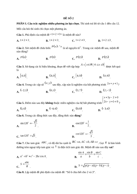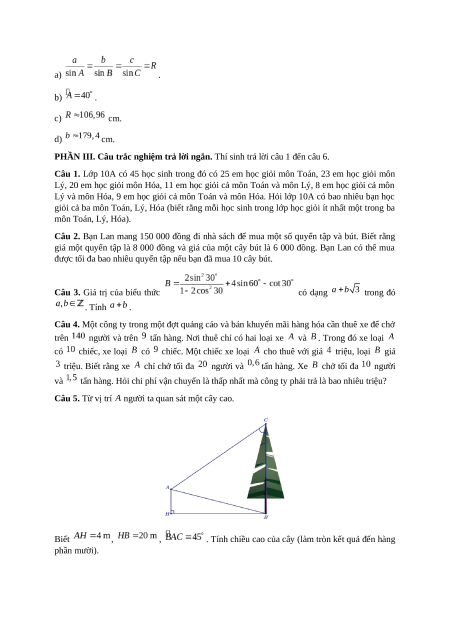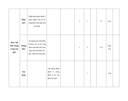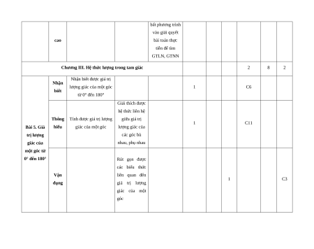 Chương III. Hệ thức lượng trong tam giác Số lệnh hỏi 3 4 2 2 11 Số điểm 0,75 1 0,75 1 3,5 6, 7, 11, 12, 4d, Câu số/Phần 4a 4b, 4c 3 5, 6 (I, II, III) I, II I, II II, III III Thành tố NL TD QGVĐ GQVĐ MHH Tổng điểm 3,25 2,75 2,5 1,5 10 Lưu ý: