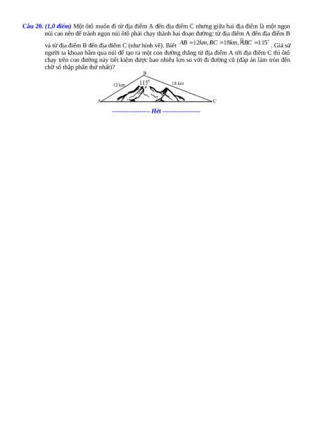 Câu 20. (1,0 điểm) Một ôtô muốn đi từ địa điểm A đến địa điểm C nhưng giữa hai địa điểm là một ngọn