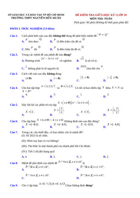 Đề thi giữa kì 1 Toán 10 trường THPT Nguyễn Hữu Huân - TP Hồ Chí Minh năm 2023-2024