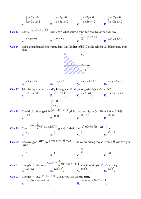 Câu 14. Trong hình vẽ dưới,phần mặt phẳng không bị gạch sọc (kể cả bờ)là miền nghiệm của hệ bất phương trình: A. . B. . C. . D. . Câu 15. Cặp số