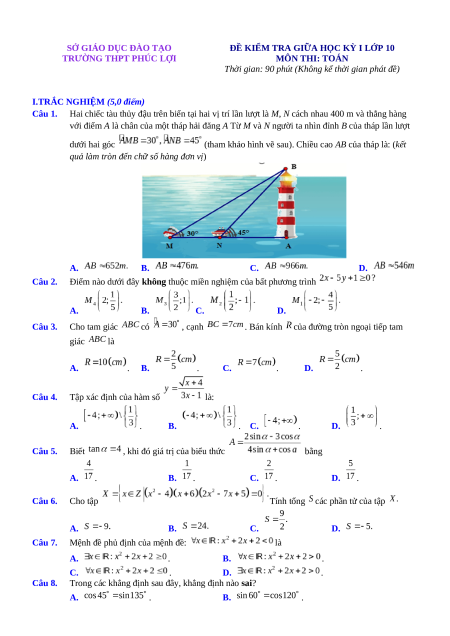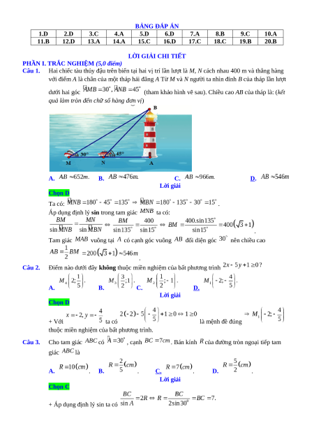 Câu 1. Hai chiếc tàu thủy đậu trên biển tại hai vị trí lần lượt là M, N cách nhau 400 m và thẳng hàng