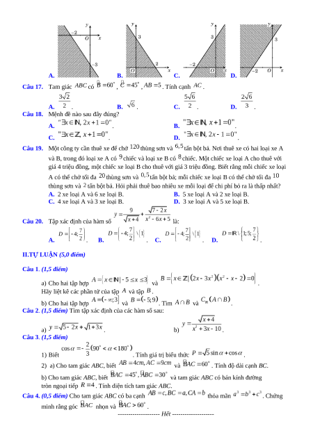 Câu 4. Tập xác định của hàm số là: A. . B. . C. . D. . Câu 5. Biết