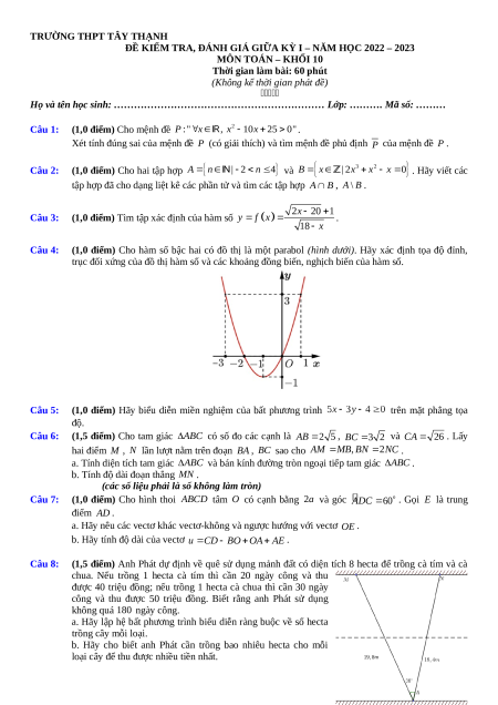 Đề thi giữa kì 1 Toán 10 trường THPT Tây Thạnh - TP Hồ Chí Minh năm 2022-2023