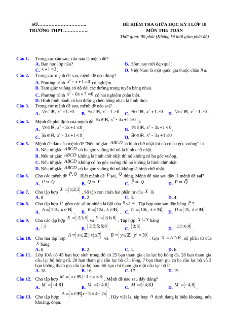 ĐỀ KIỂM TRA GIỮA HỌC KỲ I LỚP 10