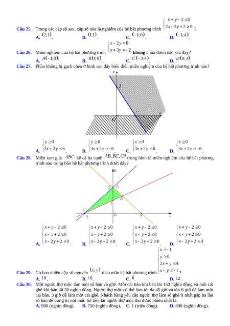 Câu 25. Trong các cặp số sau, cặp số nào là nghiệm của hệ bất phương trình ? A. . B. . C. . D. .