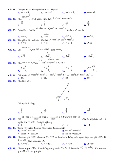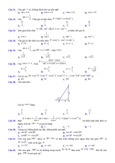 Câu 31. Cho góc tù. Khẳng định nào sau đây sai? A. . B. . C. . D. . Câu 32. Cho