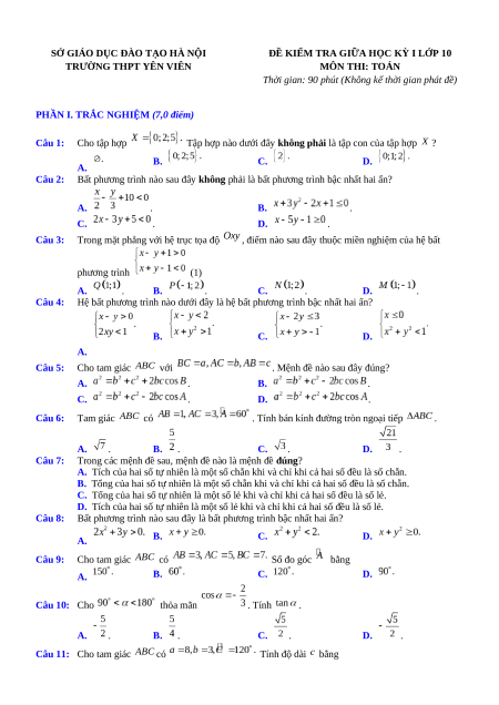 Đề thi giữa kì 1 Toán 10 trường THPT Yên Viên - Hà Nội năm 2023-2024