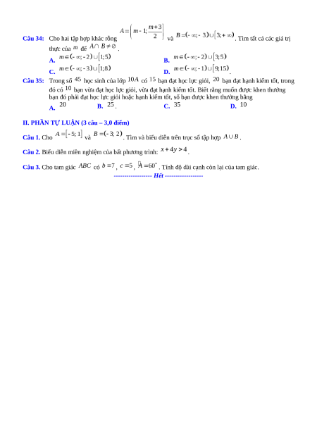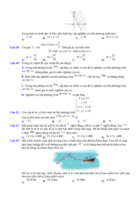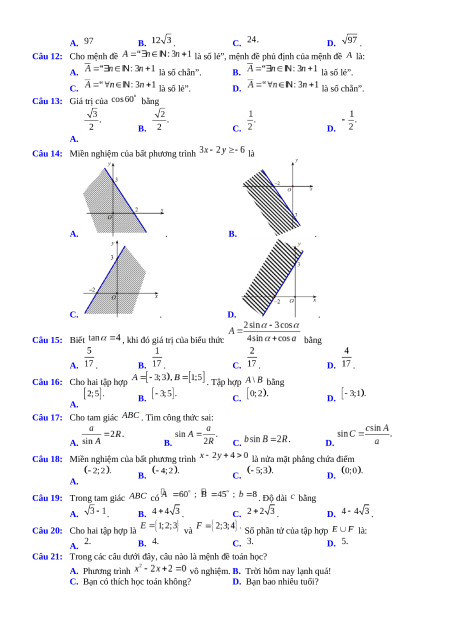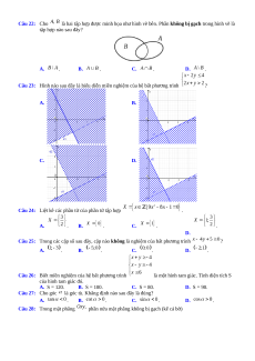 Câu 14: Miền nghiệm của bất phương trình là A. . B. . C. . D. . Câu 15: Biết