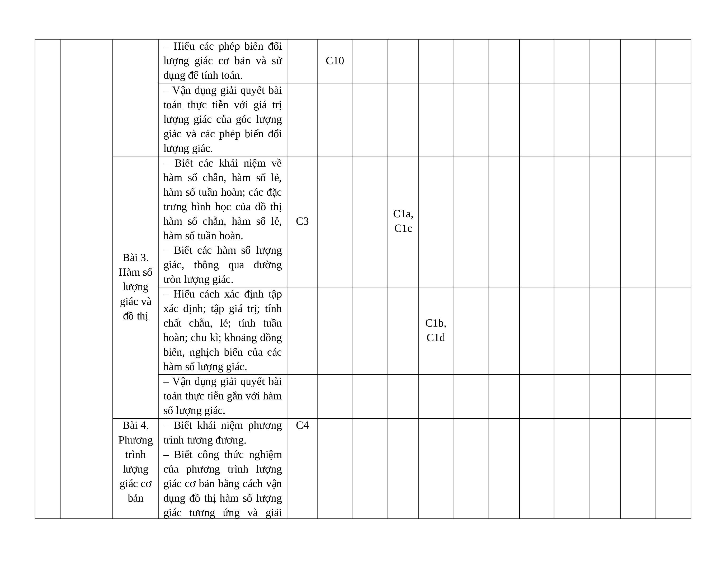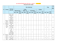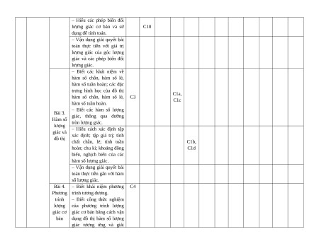 Trả lời ngắn Vận Vận Vận Vận Vận Biết Hiểu Biết Hiểu Biết Hiểu Biết Hiểu Biết Hiểu dụng dụng dụng dụng dụng Bài 1. Góc lượng giác. Giá trị 1 1 1 1 7,5 lượng giác của góc lượng giác Hàm số Bài 2. Các lượng phép biến giác và 1 1 1 1 5 đổi lượng 1 phương giác trình Bài 3. Hàm lượng số lượng giác 1 2 2 3 2 12,5 giác và đồ thị Bài 4. Phương 1 1 1 1 1 1 17,5 trình lượng giác cơ bản 2 Dãy số. Bài 1. Dãy 1 1 2,5 Cấp số số cộng và Bài 2. Cấp 1 1 3 1 4 2 15 cấp số số cộng nhân Bài 3. Cấp 1 1 1 1 1 1 17,5 số nhân Bài 1. Đường thẳng và 1 1 1 1 7,5 Đường mặt phẳng thẳng và trong mặt không gian phẳng Bài 2. Hai trong đường 3 không thẳng song 1 1 2,5 gian. song trong Quan hệ không gian song Bài 3. song Đường thẳng và 1 1 1 1 12,5 mặt phẳng song song Tổng số câu 9 3 0 5 3 0 0 4 0 0 0 3 14 10 3 Tổng số điểm 3,0 2,0 2,0 3,0 3,5 3,5 3,0 10 Tỉ lệ % 30 20 20 30 35 35 30 100 Lưu ý: