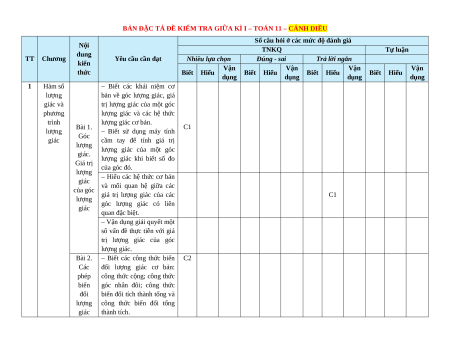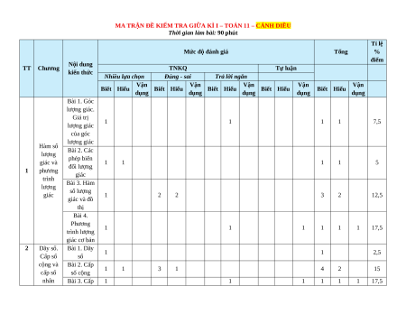 MA TRẬN ĐỀ KIỂM TRA GIỮA KÌ I – TOÁN 11 – CÁNH DIỀU