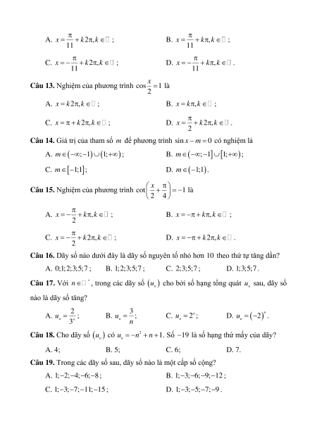 Câu 14. Giá trị của tham số m để phương trình sin x m 0 có nghiệm là A. m ; 1 1; ; B. m ; 1 1; ; C. m 1 ; 1 ; D. m 1 ; 1 . x
