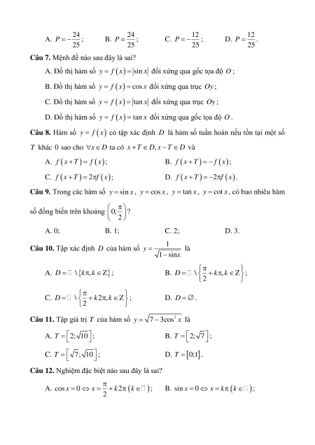 Câu 8. Hàm số y f x có tập xác định D là hàm số tuần hoàn nếu tồn tại một số