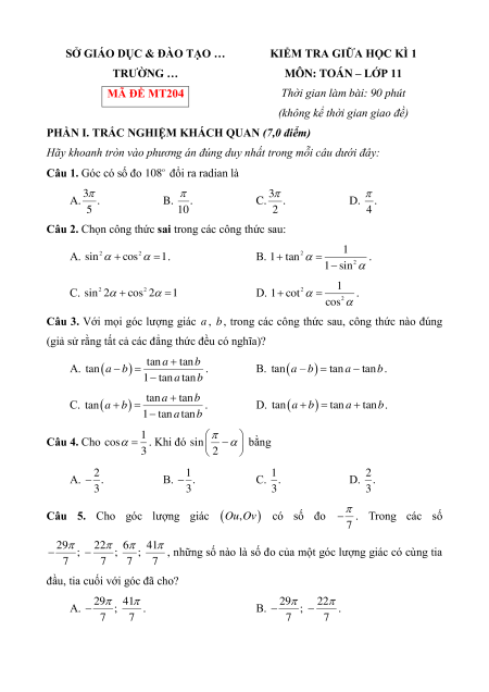 MÔN: TOÁN – LỚP 11 MÃ ĐỀ MT204