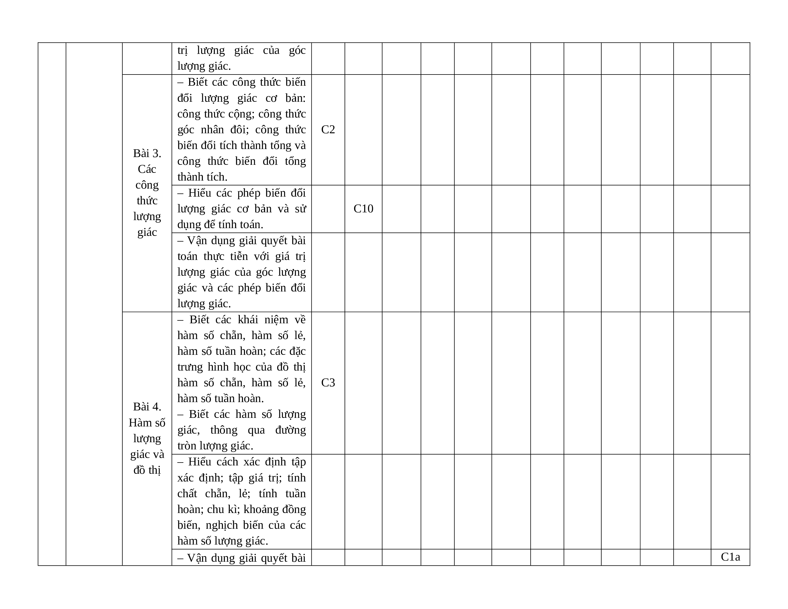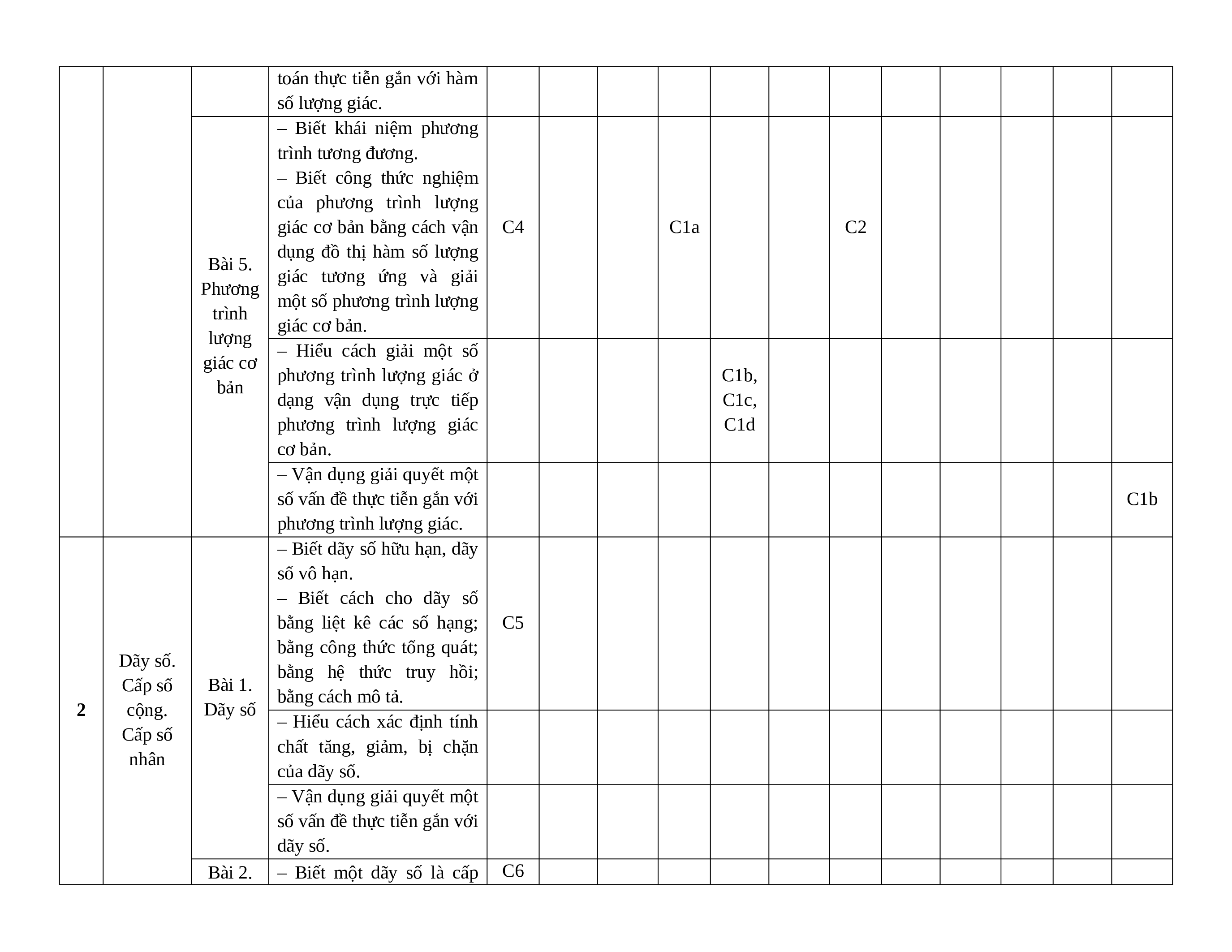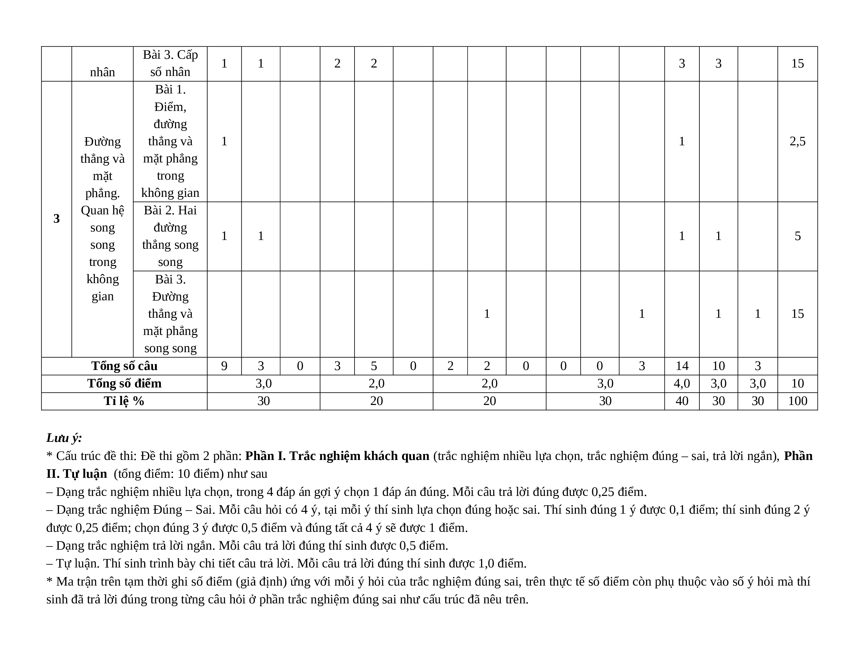 Trả lời ngắn Vận Vận Vận Vận Vận Biết Hiểu Biết Hiểu Biết Hiểu Biết Hiểu Biết Hiểu dụng dụng dụng dụng dụng Bài 1. Góc 1 1 2,5 lượng giác Bài 2. Giá trị lượng giác của 1 1 5 một góc Hàm số lượng giác lượng Bài 3. Các giác và công thức 1 1 1 1 5 1 phương lượng giác trình Bài 4. Hàm lượng số lượng giác 1 0,5 1 0,5 7,5 giác và đồ thị Bài 5. Phương 1 1 3 1 0,5 3 3 0,5 22,5 trình lượng giác cơ bản 2 Dãy số. Bài 1. Dãy 1 1 2,5 Cấp số số cộng. Bài 2. Cấp 1 1 1 1 1 1 17,5 Cấp số số cộng Bài 3. Cấp 1 1 2 2 3 3 15 nhân số nhân Bài 1. Điểm, đường Đường thẳng và 1 1 2,5 thẳng và mặt phẳng mặt trong phẳng. không gian Quan hệ Bài 2. Hai 3 song đường 1 1 1 1 5 song thẳng song trong song không Bài 3. gian Đường thẳng và 1 1 1 1 15 mặt phẳng song song Tổng số câu 9 3 0 3 5 0 2 2 0 0 0 3 14 10 3 Tổng số điểm 3,0 2,0 2,0 3,0 4,0 3,0 3,0 10 Tỉ lệ % 30 20 20 30 40 30 30 100 Lưu ý: