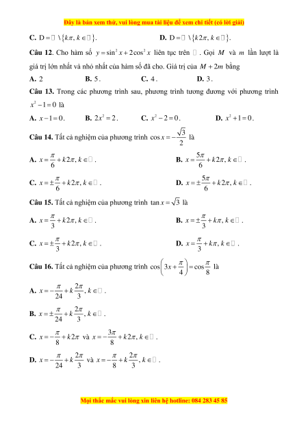 Câu 16. Tất cả nghiệm của phương trình cos 3x cos là 4 8 2 A. x k , k . 24 3 2 B. x k , k . 24 3 3 C. x