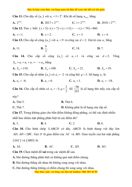 Câu 13. Cho cấp số cộng u với u 9 và công sai d 2. Giá trị của u bằng n 1 2 9 A. 11. B. . C. 18. D. 7. 2