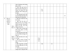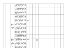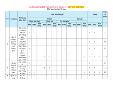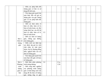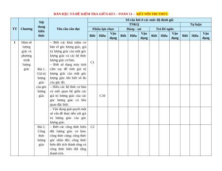 Trả lời ngắn Vận Vận Vận Vận Vận Biết Hiểu Biết Hiểu Biết Hiểu Biết Hiểu Biết Hiểu dụng dụng dụng dụng dụng Bài 1. Giá trị lượng giác của 1 1 1 1 5 góc lượng Hàm số giác lượng Bài 2. giác và Công thức 1 1 1 1 7,5 1 phương lượng giác trình Bài 3. Hàm lượng số lượng 1 1 1 1 7,5 giác giác Bài 4. Phương 1 2 2 1 3 2 1 22,5 trình lượng giác cơ bản Bài 5. Dãy Dãy số. 1 1 2,5 số Cấp số Bài 6. Cấp 2 cộng và 1 3 1 1 4 2 17,5 số cộng cấp số Bài 7. Cấp nhân 1 1 1 1 1 1 15 số nhân 3 Quan hệ Bài 10. 1 1 1 1 5 song Đường thẳng và mặt phẳng trong không gian Bài 11. Hai song đường trong 1 1 1 1 7,5 thẳng song không song gian Bài 12. Đường thẳng và 1 1 10 mặt phẳng song song Tổng số câu 9 3 0 5 3 0 0 4 0 0 0 3 14 10 3 Tổng số điểm 3,0 2,0 2,0 3,0 3,5 3,5 3,0 10 Tỉ lệ % 30 20 20 30 35 35 30 100 Lưu ý: