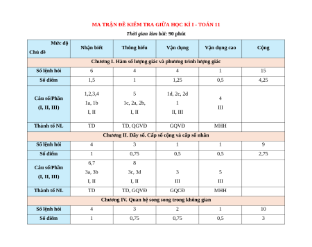 MA TRẬN ĐỀ KIỂM TRA GIỮA HỌC KÌ I - TOÁN 11