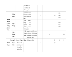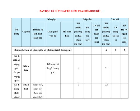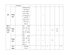 Chương I. Hàm số lượng giác và phương trình lượng giác 5 8 2 Bài 1. Giá trị lượng Đổi được số Nhận giác đo góc lượng 1 C1 biết của góc giác. lượng giác Bài 2. Nhận Nhận biết, 1 C2 Công biết phân biệt thức được các lượng công thức lượng giác. Sử dụng công thức lượng giác để biến đổi các hàm giác Thông số lượng giác 1 hiểu từ đó tính được GTLN, GTNN của hàm số. Bài 3. Xác định Hàm số được tập giá Nhận C1a, lượng trị của các 1 2 C3 biết C1b giác hàm số lượng giác. Xác định được tập xác Thông định, tính 1 2 C4 hiểu chẵn lẻ của hàm số. Vận Tính được 1 1 C1 dụng GTLN,