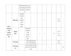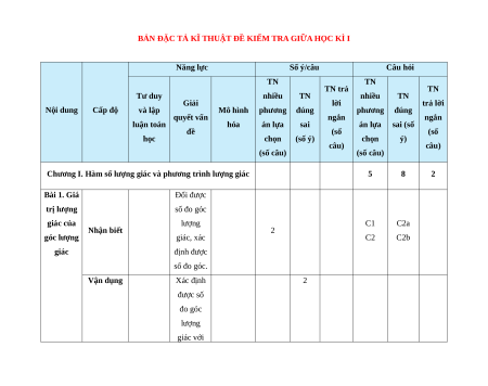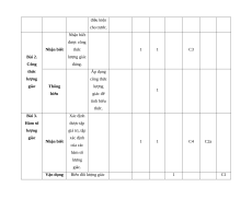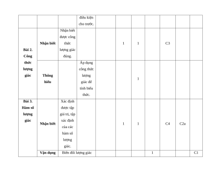 Chương I. Hàm số lượng giác và phương trình lượng giác 5 8 2 Bài 1. Giá Đổi được trị lượng số đo góc giác của lượng C1 C2a Nhận biết 2 góc lượng giác, xác C2 C2b giác định được số đo góc. Vận dụng Xác định 2 được số đo góc lượng giác với điều kiện cho trước. Nhận biết được công Nhận biết thức 1 1 C3 Bài 2. lượng giác Công đúng. thức Áp dụng lượng công thức giác Thông lượng 1 hiểu giác để tính biểu thức. Bài 3. Xác định Hàm số được tập lượng giá trị, tập giác xác định Nhận biết 1 1 C4 C2a của các hàm số lượng giác. Vận dụng Biến đổi lượng giác 1 C1