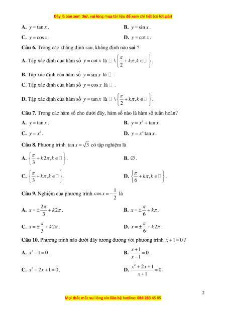 Câu 7. Trong các hàm số cho dưới đây, hàm số nào là hàm số tuần hoàn?