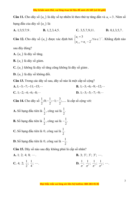 Câu 13. Trong các dãy số sau, dãy số nào là một cấp số cộng? A. 1 ; 3 ; 7 ; 11 ; 15 ; B. 1; 3 ; 6 ; 9 ; 12 ; C. 1; 2 ; 4 ; 6 ; 8 ; D. 1; 3 ; 5 ; 7 ; 9 ;