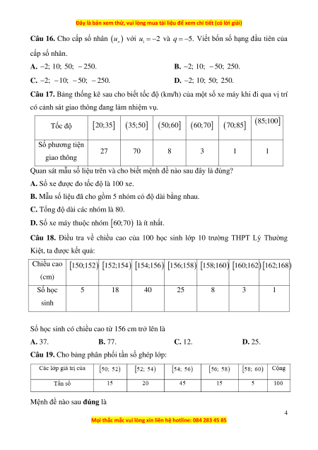 Câu 19. Cho bảng phân phối tần số ghép lớp: