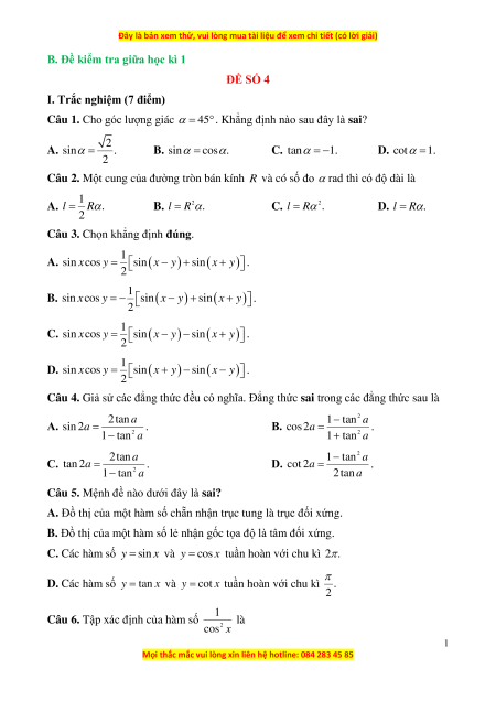 Câu 1. Cho góc lượng giác 45 . Khẳng định nào sau đây là sai? 2 A. sin . B. sin cos. C. tan 1 . D. cot 1. 2