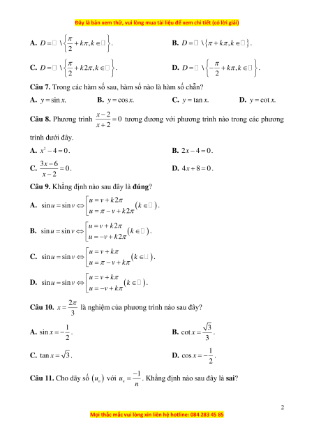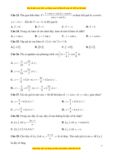 Câu 7. Trong các hàm số sau, hàm số nào là hàm số chẵn? A. y sin . x B. y cos . x C. y tan . x D. y cot . x x