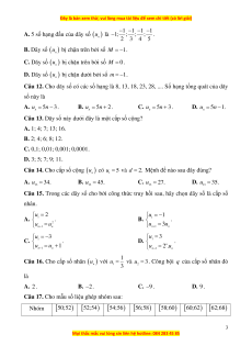 Câu 13. Dãy số này dưới đây là một cấp số cộng? A. 1; 4; 7; 13; 16. B. 2; 4; 6; 8; 12.