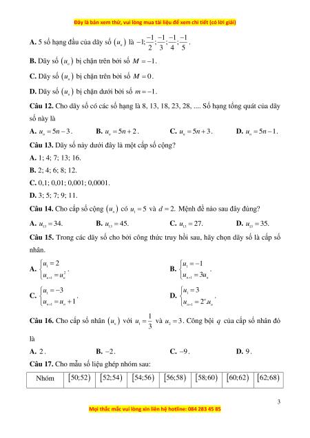 Câu 12. Cho dãy số có các số hạng là 8, 13, 18, 23, 28, .... Số hạng tổng quát của dãy số này là