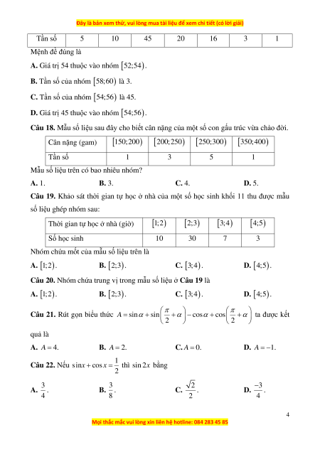 Câu 20. Nhóm chứa trung vị trong mẫu số liệu ở Câu 19 là A. 1;2. B. 2;3 . C. 3;4 . D. 4;5 .